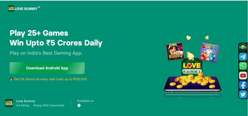 Love Rummy ek online gaming app hai jisme Rummy, Ludo, Poker aur 50+ games available hain. App download karne par ₹369 joining bonus, 7-day login bonus ₹160 aur total ₹369 tak free bonus milta hai. Daily promo codes ke saath users free me games khel kar rewards aur paisa jeet sakte hain.